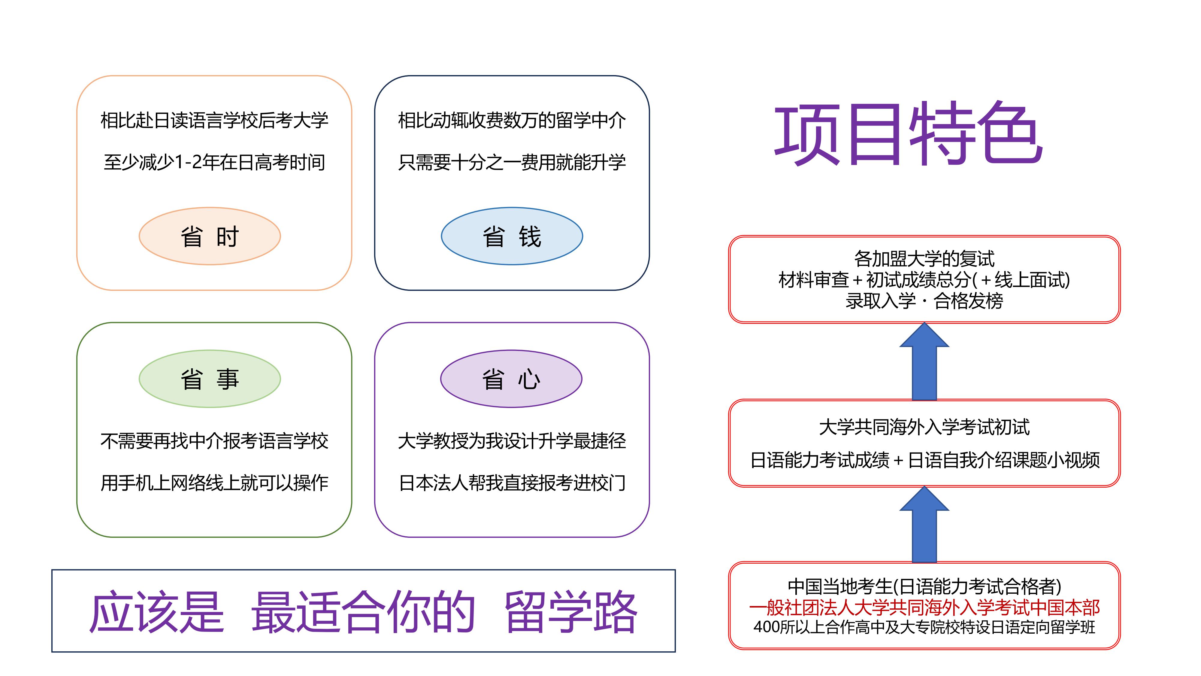 本项目由日本各大学的教授(一般社团法人理事)和各入学的考试部门直接加盟参与运作,全部考试规则和整个报名考试录取过程都由日本各大学直接掌控,可信度高无风险,全部流程的信息和数据都在一元化管理系统中。